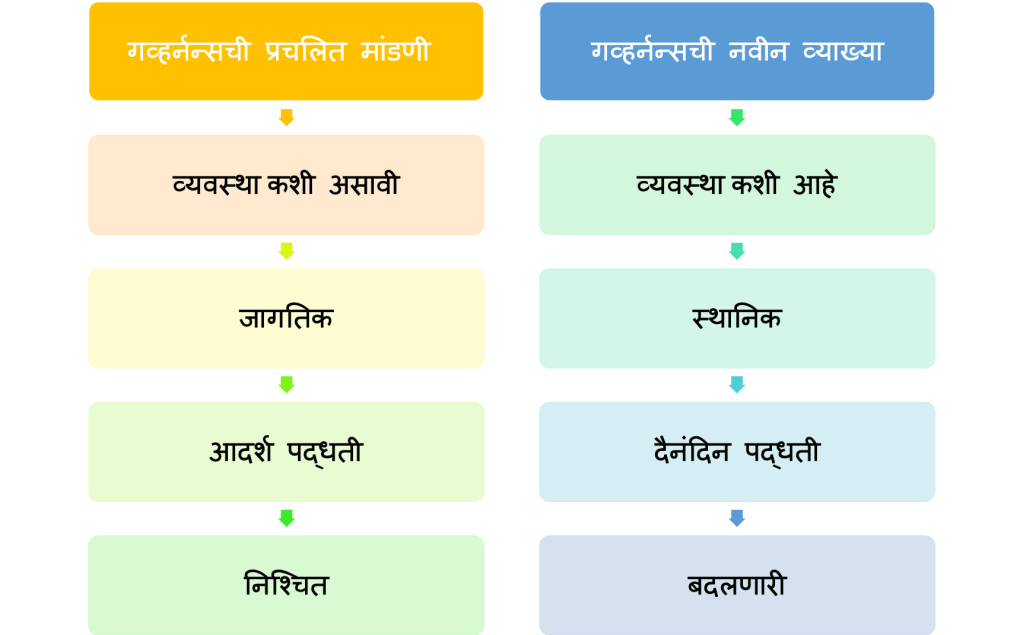 वरील उदाहरण मांडायचे कारण असे कि अश्या जुगाड आणि खोड्यांमधून आपल्याला भूजलाच्या आणि त्यातून एकूण पाण्याच्या गव्हर्नन्सची कल्पना येते. गव्हर्नन्स ची संकल्पना ही फक्त कागदावर, थिअरेटिकल न राहता ‘दैनंदिन गव्हर्नन्स’ ची मांडणी आपल्याला करता येऊ शकते. आपण अनेकदा विविध प्रकल्प, कार्यक्रम आणि योजना राबवत असतो. त्यामध्ये कागदावर काही नमूद केले असते- शास्त्रज्ञांनी- शासकीय कर्मचाऱ्यांनी- अशासकीय संस्थेतील अधिकाऱ्यांनी. पण ही झाली त्याची मांडणी. प्रत्यक्ष अनुभव काय आहे, स्थानिक परिस्थितीत काय निर्णय घेतले जातात आणि त्यातून काय मांडणी आपल्याला करता येऊ शकते हा यामागील प्रयत्न.