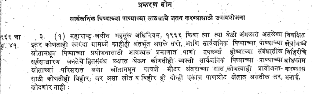कायदा काय सांगतो? १९९३ च्या भूजल कायद्यानुसार पिण्याच्या पाण्याचे स्रोत अबाधित ठेवायच्या हेतूने, वर्षभर सुरु राहावे याकरिता, स्थानिक पातळीवर दोन स्रोतांमधील अंतराचे नियमन करण्यात आले आहे. या अंतर्गत पिण्याच्या पाण्याच्या स्रोतापासून ५०० मीटरपर्यंत कोणतेही दुसरे स्रोत (सिंचनाचे किंवा खाजगी मालकीचे) नसायला हवे (तसं खाजगी काही करायचे असेल तर तशी तरतूद कायद्यात आहे म्हणा!). तसे जरी असले, तरी टंचाईच्या काळामध्ये ह्या परिसरामधील विहिरींमधून पाणी उपसा हा खाजगी उपयोगांसाठी करणे बेकायदेशीर आहे.