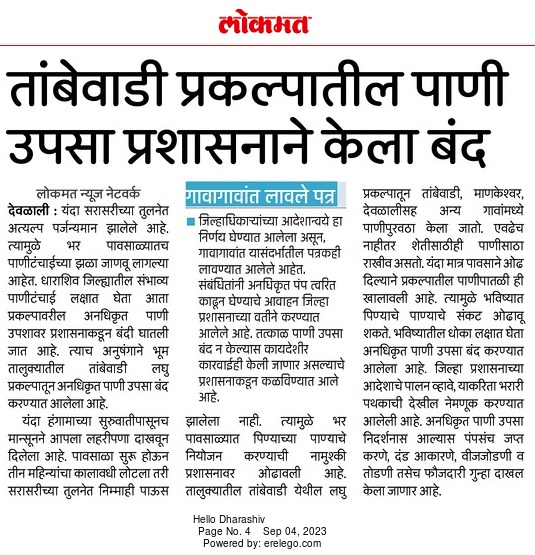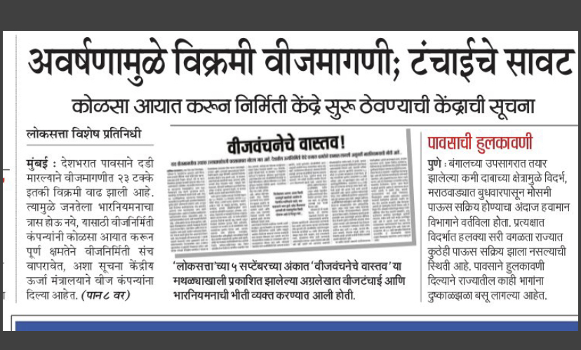 कालच्या (दिनांक ७ सप्टेंबर २०२३) लोकसत्ता मधील मुंबई आवृत्तीच्या पहिल्या पानावरील बातमी. स्पष्ट आहे की हे जल वर्ष (जुने ते पुढील मे) दुष्काळाचे वर्ष किंवा किमान पाणी टंचाईच्या वर्षाकडे वाटचाल करतंय. तुम्हाला प्रश्न पडेल की विजेची मागणी का वाढली- ते पण चक्क २३ टक्के! पाणी तर नाहीए ना, कारण पाऊसच चांगला झाला नाही? तर ही मागणी वाढली आहे भूजल उपसा करण्यासाठी. साहजिक कालव्यांमध्ये अजून पाणी नाही, नद्या कोरड्या ठाक आहेत, धरणं अजून भरली नाहीत पण ह्या सर्व परिस्थितीत देखील भूगर्भात मात्र थोडाबहुत पाणी आहे/असेल. आजपर्यंत या वर्षी झालेल्या पावसामधून थोडे पुनर्भरण म्हणा, आदिम काळापासून आपल्या पाषाण खडकांमध्ये साठलेले पाणी म्हणा, किंवा गेल्या ३-४ वर्षांची पुण्याई म्हणा (पावसाची). त्यामुळे हे थोडे पाणी जे काही आहे, ते उपसून आपल्या हक्काचे पीक, खरिपाचे पीक वाचण्याचा अतोनात प्रयत्न शेतकरी करताय.