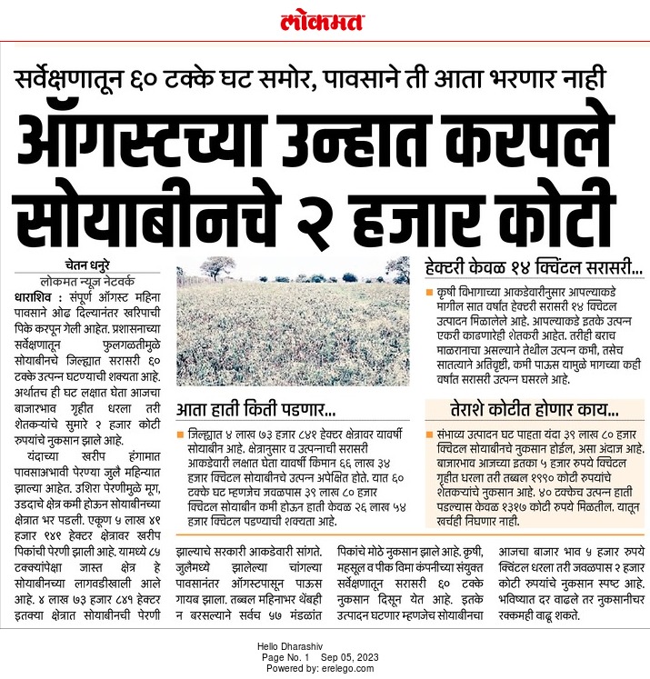 परवाच्या ‘हॅलो धाराशिव’ पेपरमधील बातमी. धाराशिव (उस्मानाबाद) जिल्ह्यातील २००० कोटींच्या सोयाबीनचे नुकशान झाले आहे असं जिल्हा कृषी विभागाने केलेल्या सर्व्हेतून पुढे आले आहे. ऑगस्ट मध्ये पाऊसच झाला नाही (एकदम कमी झाला) त्यामुळे सोयाबीनची फुलं पडली आणि म्हणून त्याचा परिणाम सोयाबीन पिकावर येणार आहे. गम्मत (गम्मत इथे विरोधाभासाने वापरतोय) अशी आहे की दोनच महिन्यापूर्वी जिल्ह्यातील सोयाबीन शिवारामधील गोगलगायींच्या प्रादुर्भावाने पेचात पडला होता. शेतकरी वेचून वेचून गोगलगाय बाहेर काढत होते. पाऊस झाल्यावर आणि गेल्या काही वर्षांमध्ये जिल्ह्यात एकूणच सोयाबीनची लागवड वाढल्यामुळे गोगलगाय यांचा प्रश्न निर्माण झाला. आधी फक्त ओढ्या-नाल्याजवळील शिवारात हा प्रश्न आहे असे म्हंटले जात होते पण नंतर हा सर्वदूर प्रश्न आहे असे समोर येऊ लागले.